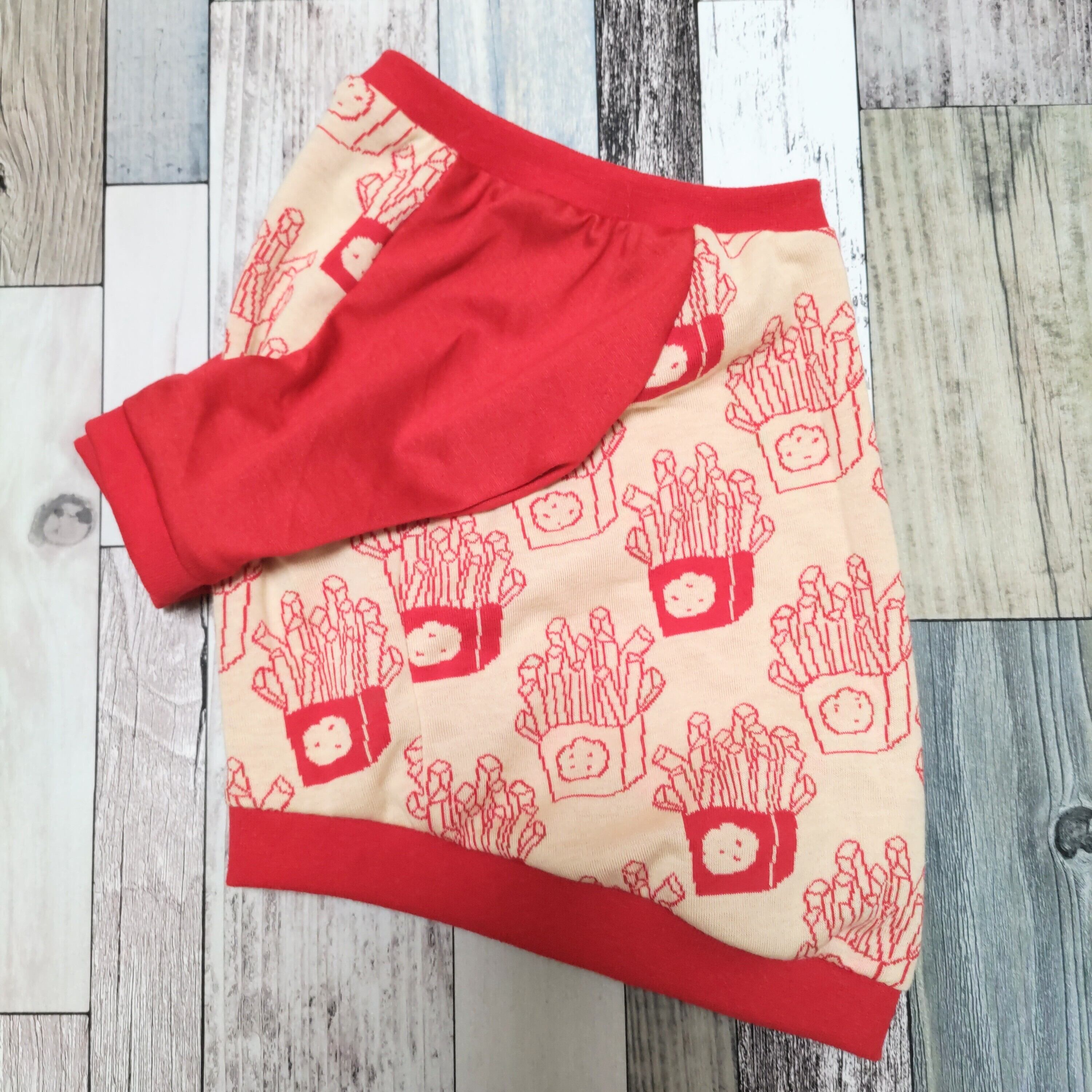 前身頃、後ろ身頃にはポテト柄の接結ニット生地、袖は赤のニット生地を使用しました。
